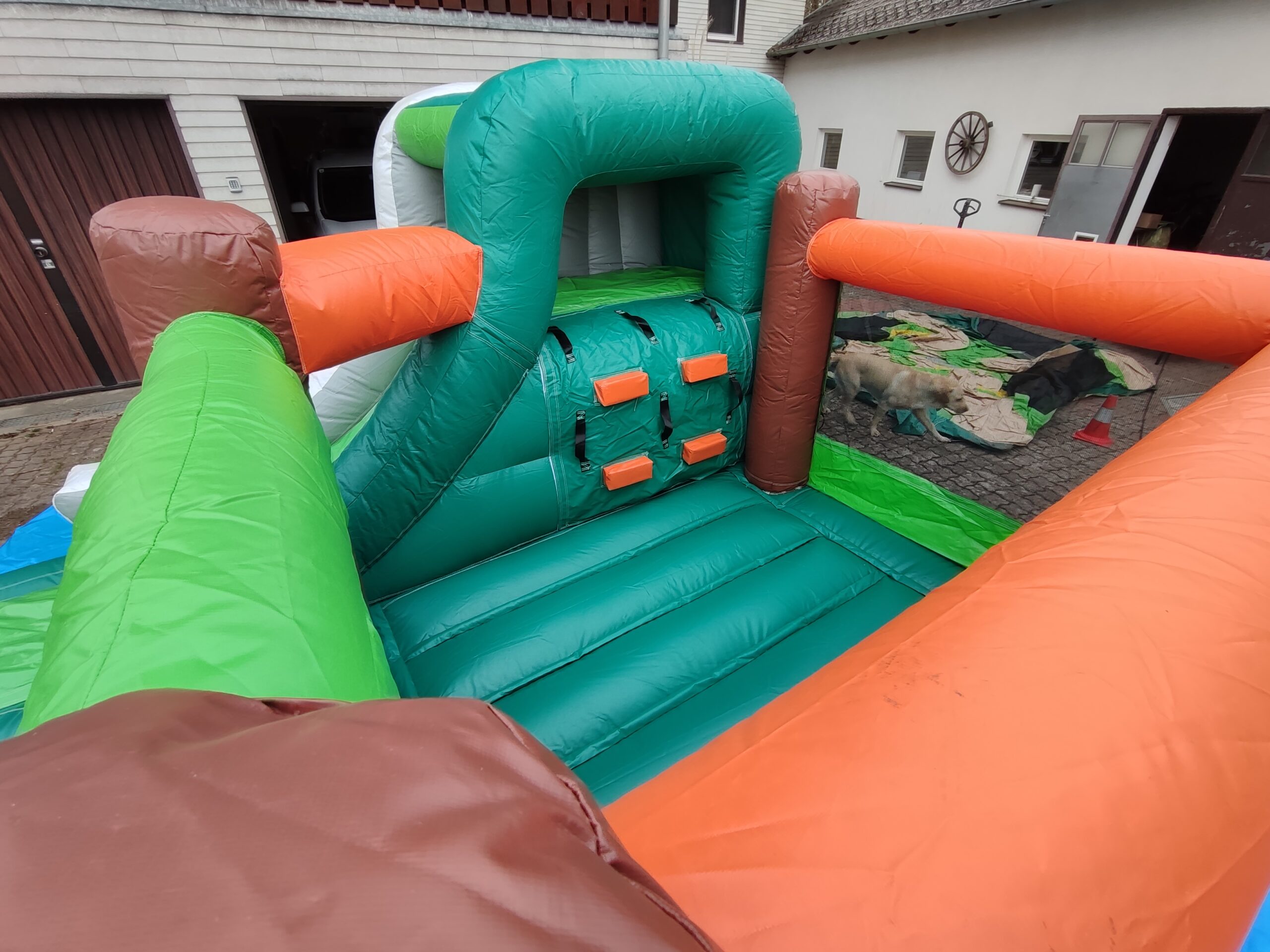 Kapazität und Maße: Die großzügige Größe der Hüpfburg bietet Platz für 4-6 Kinder gleichzeitig. Maße: 3,75 m x 3,3 m und 2,1 m hoch (Maße inkl. Rutsche). Packmaß: ca. 80 × 60 cm und 60 cm hoch. 60 kg (für Gebläse und Anschluss zusätzlich ~ 1,80m an der Rückseite)